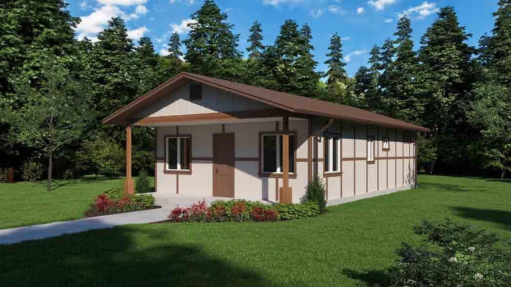 This design is a petite ranch-style home that offers an efficient, single-level layout inspired by Paradise’s local popular hiking site, The Flumes. The home features an open space plan for the living room, dining, and kitchen areas, along with two bedrooms, two baths, and nooks for indoor laundry and spacious closets. This traditional design is a community favored style for residents hoping to rebuild. The covered front porch and easy access to the backyard is perfect for California living and enjoying the outdoor scenery of mountain forests.