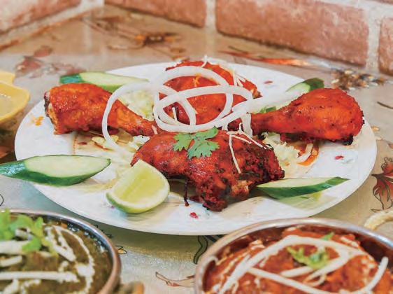 ↑香料烤雞咖哩加入番茄燉煮,搭配不同口味、烤得微微焦 香的烤餅,好吃得讓人停不下來。