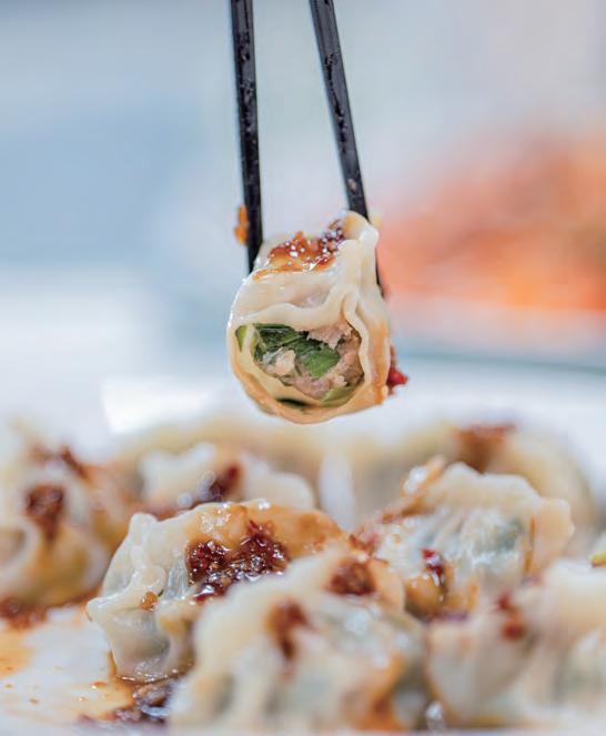 ↑手工製作的撞牆水餃皮 Q餡多又飽滿,配上微辣 沾醬很對味。