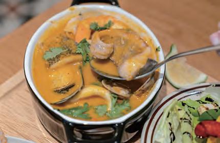 濃郁鮮味湯頭和滿滿配料,讓人彷彿置身 南法的馬賽海岸。其中最吸睛的,莫過於 上桌時主廚會在桌邊倒酒點火的可可火焰