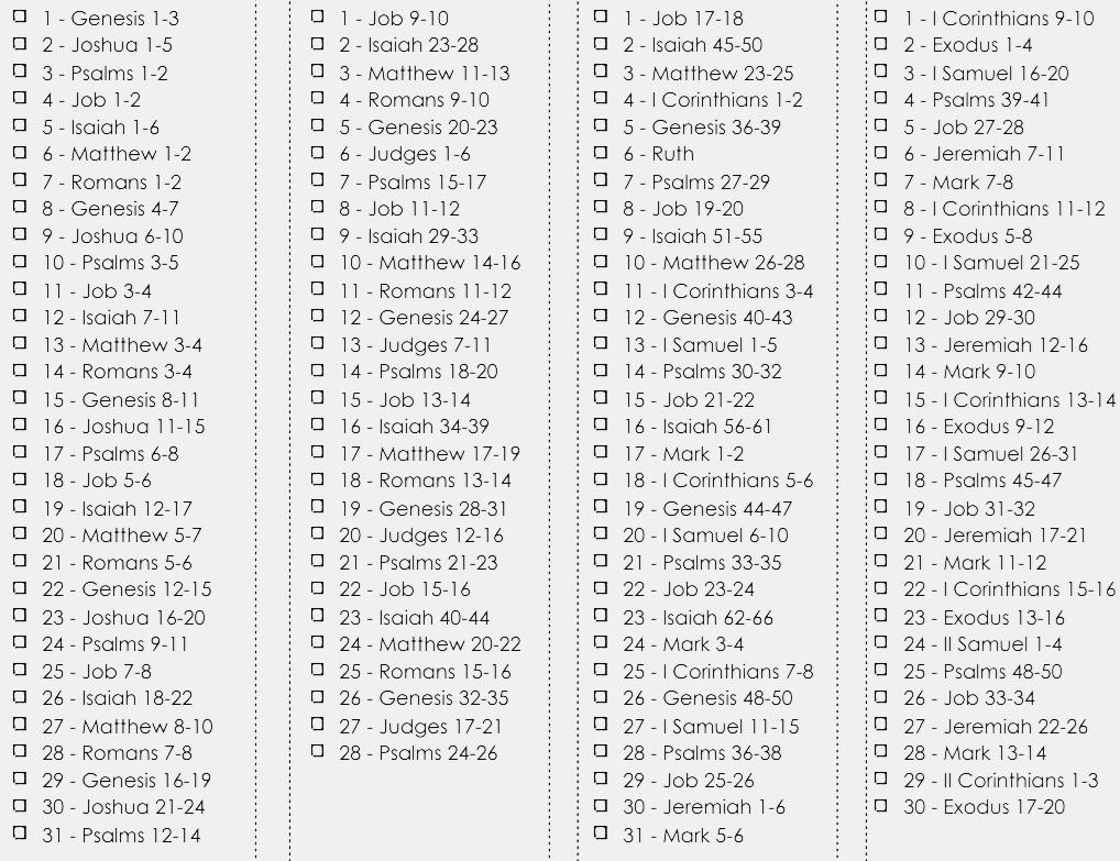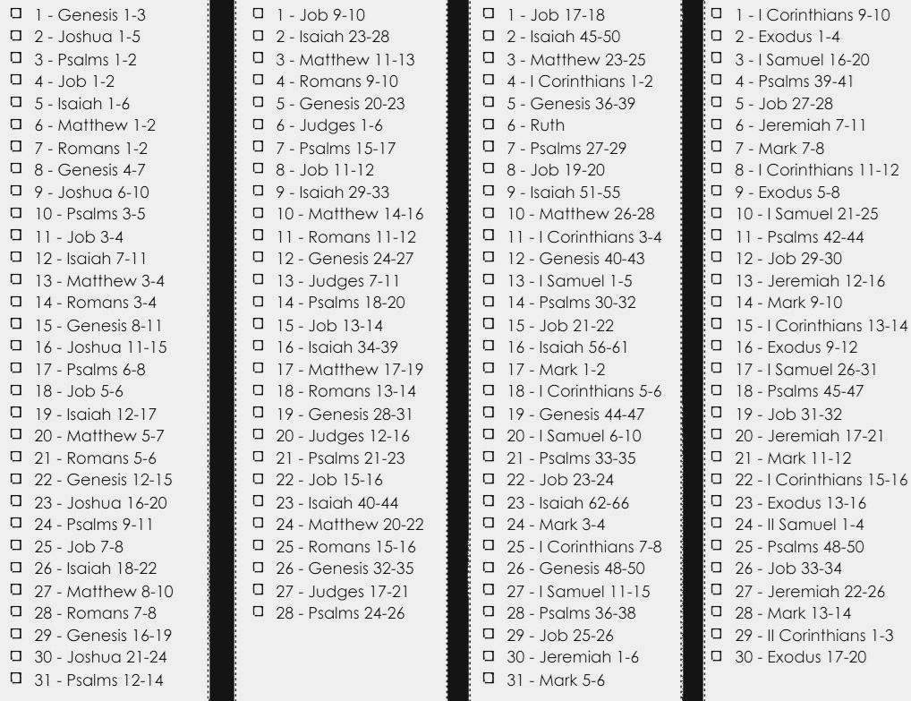 Most Christians never completely read the whole Bible. Many people start reading the Bible but then become overwhelmed by the number of chapters (1,189) and verses (31,102) there are What we don't realize is that we can read the Bible in a year by reading fewer than four chapters a day By dividing the Bible into 365 daily readings, your goal of reading the Bible in a year can easily be accomplished, so let us do this together! Click here to read Bible Society online bible.
