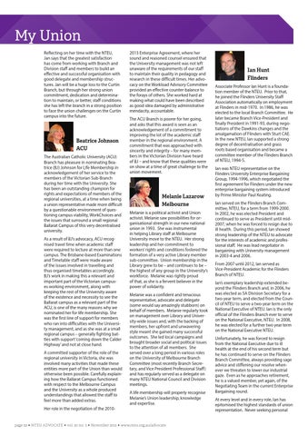 2013 Enterprise Agreement, where her sound and reasoned counsel ensured that the University management was not left unaware of the requirements of our staff to maintain their quality in pedagogy and research in these difficult times. Her advocacy on the Workload Advisory Committee provided an effective counter-balance to the forays of others. She worked hard at making what could have been described as good idea damaged by administrative mendacity, accountable. The ACU Branch is poorer for her going, and asks that this award is seen as an acknowledgement of a commitment to improving the lot of the academic staff member in the regional environment. A commitment that was approached with sincerity and integrity – for many members in the Victorian Division have heard of BJ – and know that these qualities were on show at a time of great challenge to the union movement.
