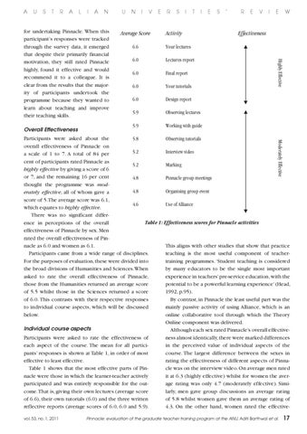 Participants were asked about the 5.8 Observing tutorials overall effectiveness of Pinnacle on 5.2 Interview video a scale of 1 to 7. A total of 84 per cent of participants rated Pinnacle as 5.2 Marking highly effective by giving a score of 6 or 7, and the remaining 16 per cent 4.8 Pinnacle group meetings thought the programme was mod4.8 Organising group event erately effective, all of whom gave a score of 5.The average score was 6.1, 4.6 Use of Alliance which equates to highly effective. There was no significant differTable 1: Effectiveness scores for Pinnacle activities ence in perceptions of the overall effectiveness of Pinnacle by sex. Men rated the overall effectiveness of Pinnacle as 6.0 and women as 6.1. This aligns with other studies that show that practice Participants came from a wide range of disciplines. teaching is the most useful component of teacherFor the purposes of evaluation, these were divided into training programmes. ‘Student teaching is considered the broad divisions of Humanities and Sciences. When by many educators to be the single most important asked to rate the overall effectiveness of Pinnacle, experience in teachers’ pre-service education, with the those from the Humanities returned an average score potential to be a powerful learning experience’ (Head, of 5.5 whilst those in the Sciences returned a score 1992, p.95). of 6.0. This contrasts with their respective responses By contrast, in Pinnacle the least useful part was the to individual course aspects, which will be discussed mainly passive activity of using Alliance, which is an below. online collaborative tool through which the Theory Online component was delivered. Individual course aspects Although each sex rated Pinnacle’s overall effectiveParticipants were asked to rate the effectiveness of ness almost identically, there were marked differences each aspect of the course. The mean for all particiin the perceived value of individual aspects of the pants’ responses is shown at Table 1, in order of most course. The largest difference between the sexes in effective to least effective. rating the effectiveness of different aspects of PinnaTable 1 shows that the most effective parts of Pincle was on the interview video. On average men rated nacle were those in which the learner-teacher actively it at 6.3 (highly effective) whilst for women the averparticipated and was entirely responsible for the outage rating was only 4.7 (moderately effective). Simicome. That is, giving their own lectures (average score larly, men gave group discussions an average rating of 6.6), their own tutorials (6.0) and the three written of 5.8 whilst women gave them an average rating of reflective reports (average scores of 6.0, 6.0 and 5.9). 4.3. On the other hand, women rated the effectivevol. 53, no. 1, 2011