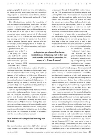 guage, geographic location and even prior education no extra cost through dedicated ‘skills centres’ includno longer prohibit individuals from entering univering the CQU Communications Learning Centre and sity programs as universities create flexible pathways Learning Skills Units. These centres are proactive and to accommodate the backgrounds and needs of their effective offering academic skills workshops, short diverse students. courses and individual advice in person and over The following trends indicate the complexity of the internet as required. Many students elect to take this diversification in Australian universities. The total advantage of these services; many don’t. A key reason number of persons studying for a qualification who students may not participate in such ‘add on’ study attained a bachelor degree increased from 14 per cent support sessions is the natural tendency to prioritise in May 1997 to 21 per cent in May 2007 which repworkloads associated with for-credit course work. resents the most notable increase of all educational A quick survey of universities in Australia confirms sectors (ABS, 2007a). Not only are there more Australthat study skills support is widely available in diverse ians entering university per capita, but they derive modes including one to one and group based sesfrom increasingly disparate social contexts reflected, sions, face to face and remote mode, as well as text for example, in the changing trends in student age based support online or in print. Group-based, delivery under half of the 2.5 million Australians studying for modes are referred to by a host of terms including but a qualification in 2007 (43 not limited to: ‘courses’, per cent) were in the 15 to ‘workshops’, ‘units’, ‘tutoAn important question confronting the 19 age group (ABS, 2007b) rials’, ‘lectures’ and ‘proinstitution and its teaching staff is: how can - and study mode - univergrams’. Schedules for these curriculum be revised to accommodate the sity students studying from sessions are almost invarianeeds of ... diverse learners? home increased 4 per cent bly accompanied by careful per year between 1982qualification and reminder 1993 (ABS, 1995). A further that such learning sessions contributing factor to increased student diversity in are ‘not for credit’ towards a degree. The reluctance of Australian universities has been steadily growing numFaculties to credit the study of ‘learning’ itself is by no bers of international students moving from under 19 means confined to Australian universities. US and UK per cent of all enrolments in 2001 to over 25 per cent based universities also tend to offer study support as a in 2008 (Ross 2008, p.6). At CQU, the proportion of ‘not for credit’ service although the availability of such international students is significantly higher at over 40 support seems more limited than within Australian per cent. Clearly, any notion of a ‘typical’ student as an institutions and is more commonly available as a founAustralian high school graduate studying fulltime on dation or preparatory, fee-based study program rather Campus is increasingly redundant. than a value added service for enrolled degree stuCQU has experienced particularly dramatic diversifidents (UCLA and Coventry University are examples). cation of its student population for two main reasons: At a recent symposium on the standard of English first, as a regional institution, it provides programs communication skills achieved by Australian university across vast distances allowing students in diverse graduates (AEI, 2007), many industry representatives locations and communities to study internally or by bemoaned the reluctance of university Faculties to distance; second, CQU’s interstate metropolitan caminclude continuing English communication developpuses attract large numbers of international students ment as part of for-credit courses. Plentiful study texts from over a hundred different countries. An important are published by institutions explaining to students question confronting the institution and its teaching how to succeed at Australian universities and English staff is: how can curriculum be revised to accommoexpression, written and oral, technical and stylistic, date the needs of such diverse learners? features centrally in such study skills texts. However, if universities do indeed seek to promote active and How the sector incorporates learning how collaborative learning as recommended by Chickerto learn ing and Gramson (1994), they must move beyond a text based strategy. Those institutions who accept that Like most Australian universities, CQU offers internal learning to learn, unlearn and re-learn is not only benstudy support options and services for all students at eficial but crucial for learners to progress both in their vol. 53, no. 1, 2011