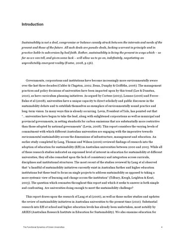 Governments, corporations and institutions have become increasingly more environmentally aware over the last three decades (Calder & Clugston, 2002; Benn, Dunphy & Griffiths, 2006). The management practices and policy decisions of universities have been impacted upon by this trend (Lee & Dunstan, 2010), as have curriculum planning initiatives. As argued by Cortese (2003), Lozano (2006) and FerrerBalas et al (2008), universities have a unique capacity to direct scholarly and public discourse in the sustainability debate and to establish themselves as exemplars of environmentally sound practice and long-term vision. In many ways this is already occurring. Levin, President of Yale, has pointed out that “…universities have begun to take the lead, along with enlightened corporations as well as municipal and provincial governments, in setting standards for carbon emissions that are substantially more restrictive than those adopted by national governments” (Levin, 2008). This report considers the varying levels of commitment with which different Australian universities are engaging with the imperative towards environmental sustainability across the dimensions of infrastructure, management and education. An earlier study completed by Lang, Thomas and Wilson (2006) reviewed findings of research into the adoption of education for sustainability (EfS) in Australian universities between 2000 and 2005. While all of these research studies indicated an expressed level of interest in education for sustainability at different universities, they all also remarked upon the lack of consistency and integration across curricula, disciplines and institutional structures. The most recent of the studies reviewed by Lang et al observed that “a handful of sustainability initiatives currently exist in Australian further and higher education institutions but these tend to focus on single projects to address sustainability as opposed to taking a more systemic view of learning and change across the institution” (Tilbury, Keogh, Leighton & Kent, 2005). The question which resonates throughout this report and which it seeks to answer is both simple and confronting. Are universities doing enough to meet the sustainability challenge? This report draws upon the research of Lang et al (2006), as well as those earlier studies and updates the review of sustainability initiatives in Australian universities to the present time (2010). Substantial research into EfS at school and higher education levels has already been undertaken, most notably by ARIES (Australian Research Institute in Education for Sustainability). We also examine education for