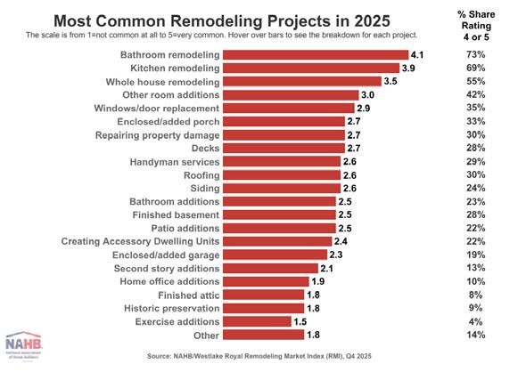 Every quarter, the National Association of Home Builders (NAHB) conducts a survey of professional remodelers. The first part of the survey collects the information required to produce the NAHB/Westlake Royal Remodeling Market Index (RMI). The survey collects information required to produce an overall reading which is calculated by averaging two indices: 1) the Current Conditions Index and 2) the Future Indicators Index. The Current Conditions Index is an average of three components: the current market for large remodeling projects ($50,000 or more), moderately sized projects (at least $20,000 but less than $50,000) and small projects (under $20,000). The Future Indicators Index is an average of two components: the current rate at which leads and inquiries are coming in, and the current backlog of remodeling projects. Results for Q4 2025 were released earlier this month which can be accessed (by visiting www.nahb.org , eye on housing section).