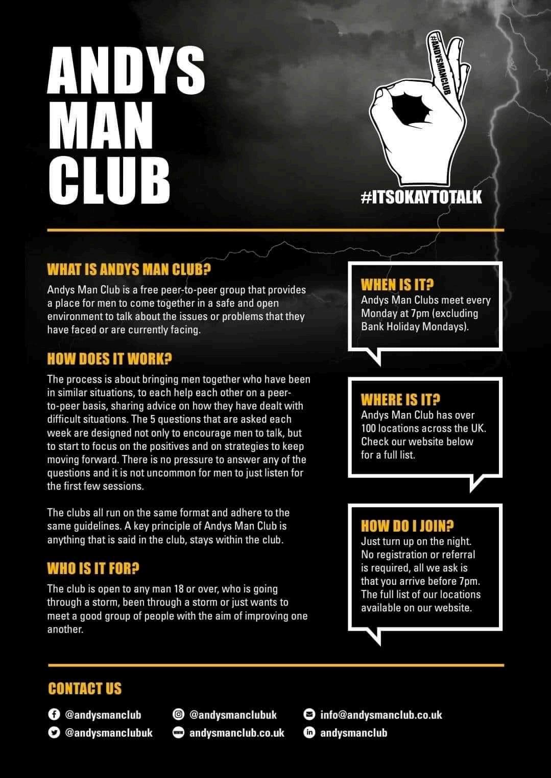 Andy’s Man Club are a men’s suicide prevention charity, offering free to attend peer-to-peer support groups across the UK.