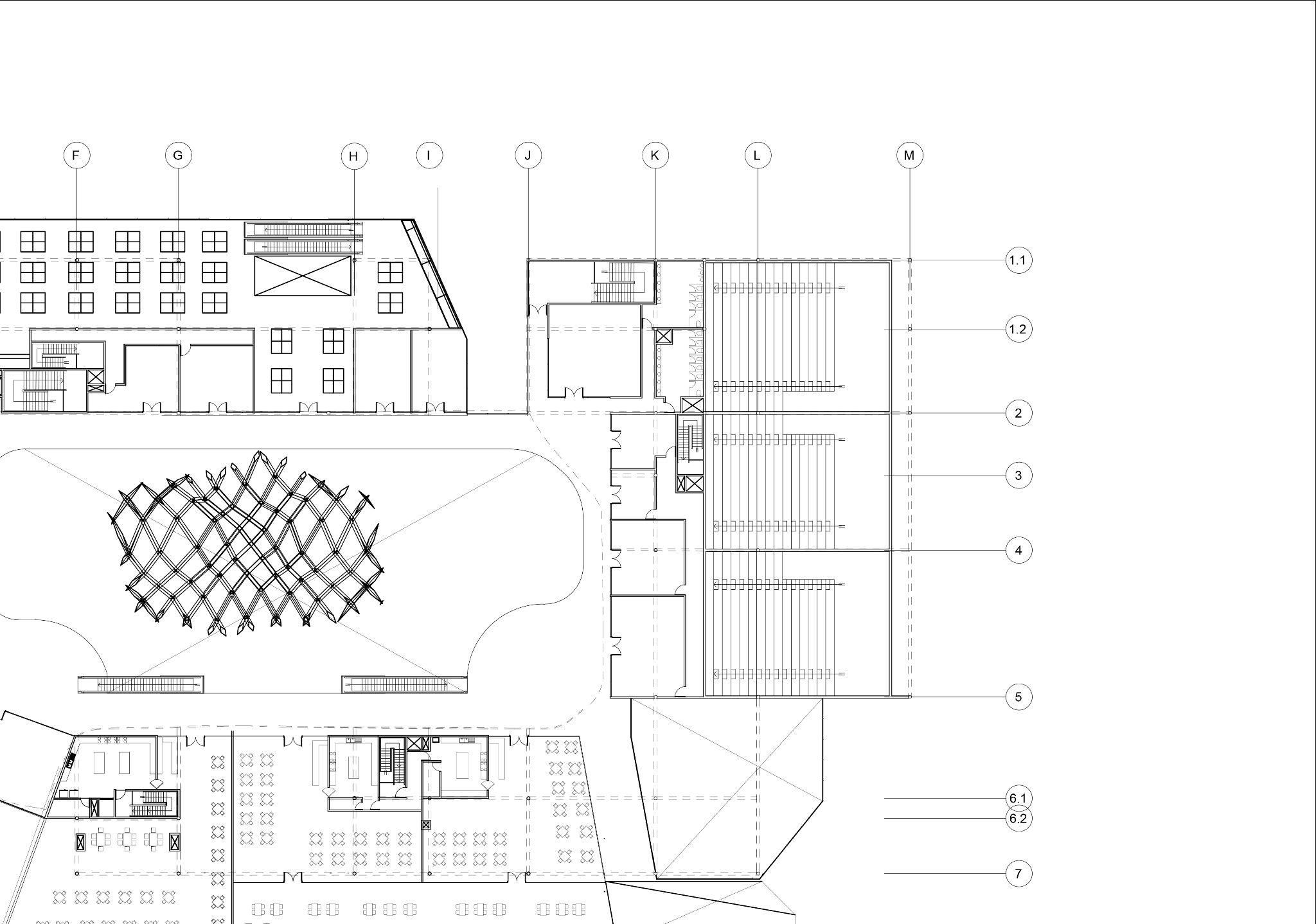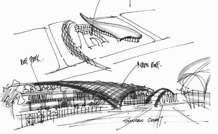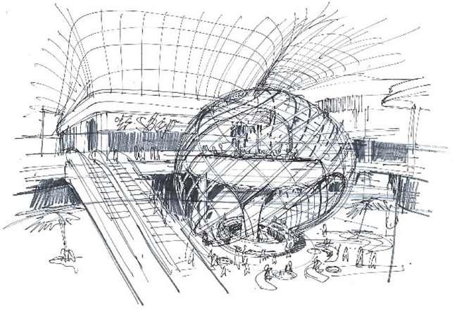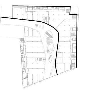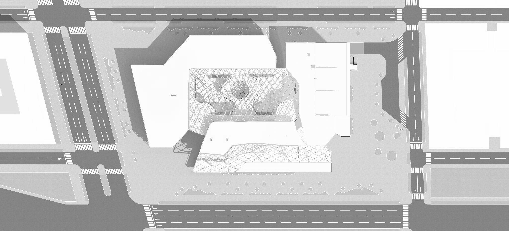 Al cubrir la zona central este baja en forma de un remolino, generando así un atractivo central el cual conecta las 4 islas (volúmenes), de tal forma que las actividades se complementen a través de la circulación generada por el elemento central, además esto proporciona también de una conexión visual entre niveles, logrando así un único objeto.