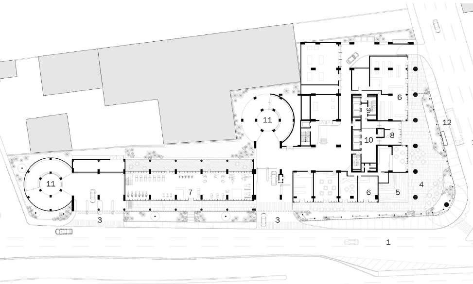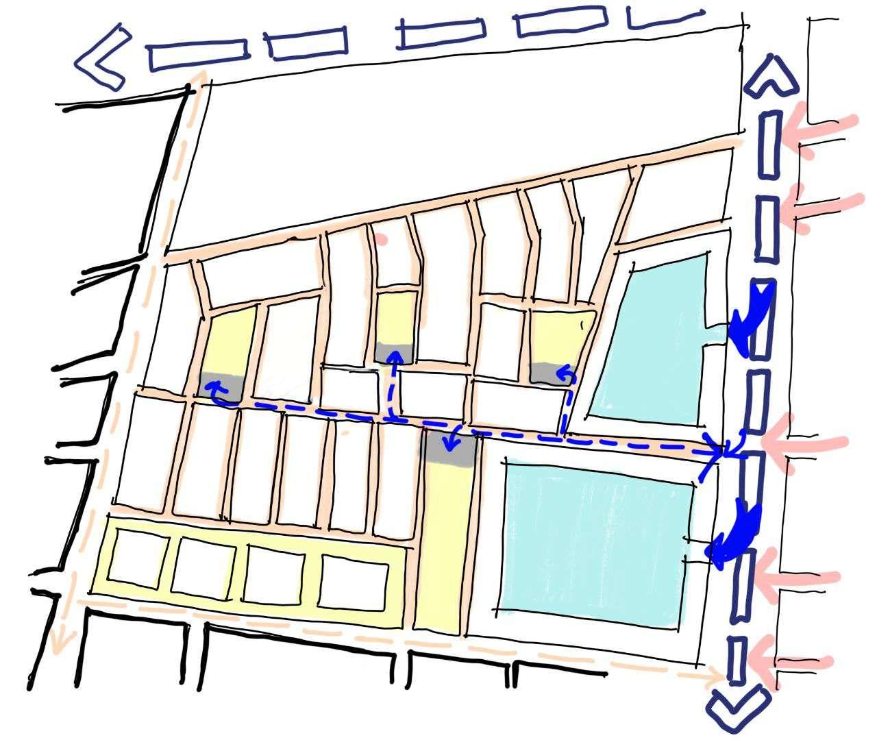 1.Reutilización de terrenos y edificio 5.Acceso al espacio público compacto6.Estacionamientoflexible
