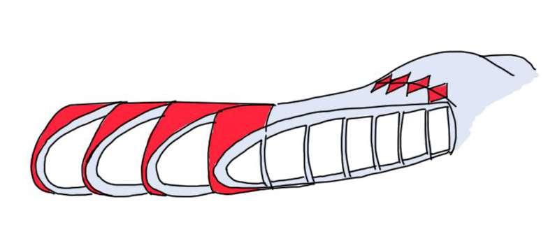 El elemento cual ola de mar, llega hasta los volúmenes y trepa sobre ellos, generando esta cubierta sinuosa irregular