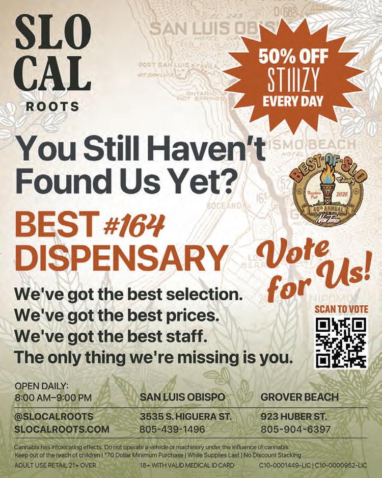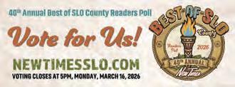 The San Luis Obispo City Council invites all interested persons to attend a public hearing on Tuesday, March 3, 2026 at 5:30 p.m. in the Council Chambers at City Hall, 990 Palm Street, San Luis Obispo. Meetings may be viewed remotely by joining the Zoom webinar via the details published on the cover of the agenda, on Government Access Channel 20, or streamed live from the City’s YouTube channel at www.youtube.com/ CityofSanLuisObispo. Public comment, prior to the start of the meeting, may be submitted in writing via U.S. Mail delivered to the City Clerk’s office at 990 Palm Street, San Luis Obispo, CA 93401 or by email to emailcouncil@ slocity.org.