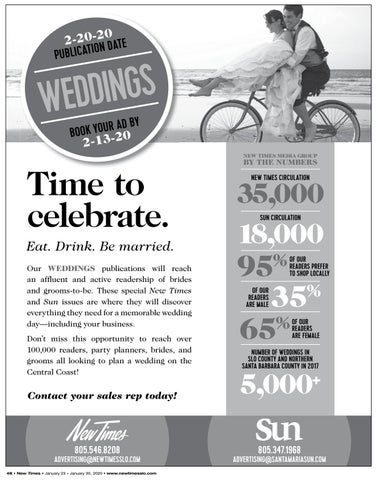 Time to celebrate. Eat. Drink. Be married. Our WEDDINGS publications will reach an affluent and active readership of brides and grooms-to-be. These special New Times and Sun issues are where they will discover everything they need for a memorable wedding day—including your business. Don’t miss this opportunity to reach over 100,000 readers, party planners, brides, and grooms all looking to plan a wedding on the Central Coast!