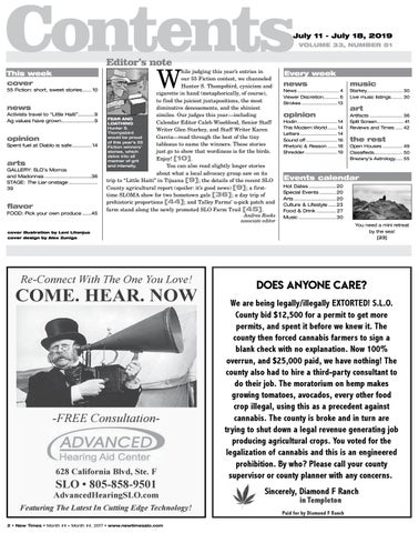 hile judging this year’s entries in our 55 Fiction contest, we channeled Hunter S. Thompsbird, cynicism and cigarette in hand (metaphorically, of course), to find the juiciest juxtapositions, the most diminutive denouements, and the shiniest similes. Our judges this year—including FEAR AND Calendar Editor Caleb Wiseblood, Senior Staff LOATHING Hunter S. Writer Glen Starkey, and Staff Writer Karen Thompsbird Garcia—read through the best of the tiny would be proud of this year’s 55 tableaus to name the winners. These stories Fiction winners’ stories, which just go to show that wordiness is for the birds. delve into all Enjoy! [10]. manner of grit and intensity. You can also read slightly longer stories about what a local advocacy group saw on its trip to “Little Haiti” in Tijuana [9] ; the details of the recent SLO County agricultural report (spoiler: it’s good news) [9] ; a firsttime SLOMA show for two hometown gals [36] ; a day trip of prehistoric proportions [44] ; and Talley Farms’ u-pick patch and farm stand along the newly promoted SLO Farm Trail [45].