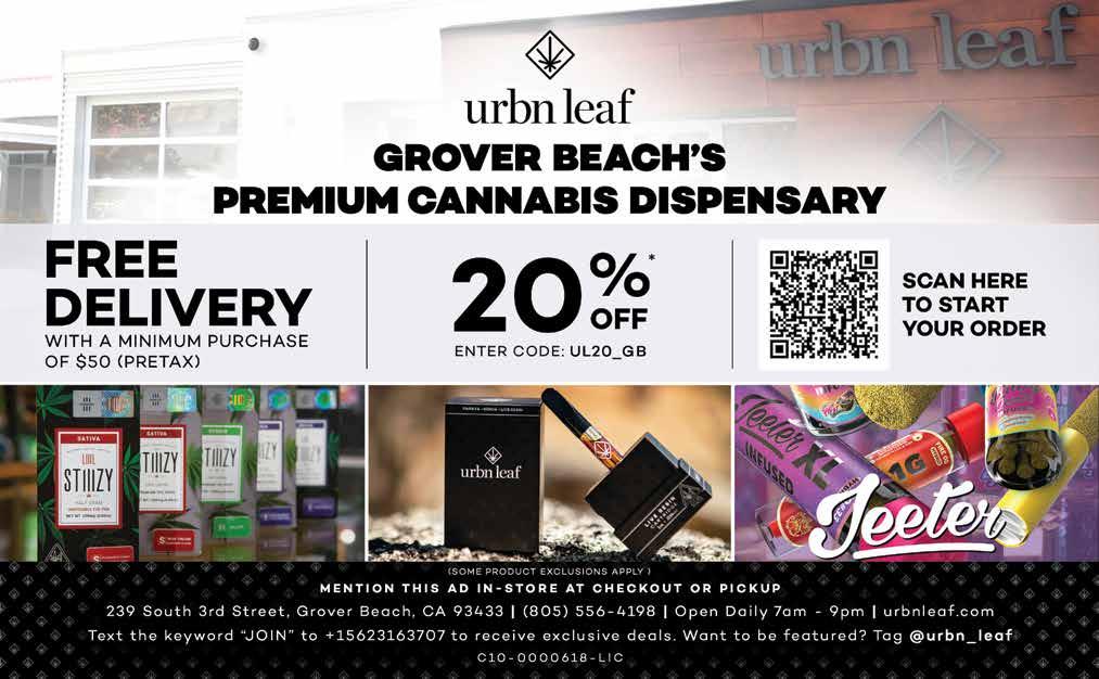 www.newtimesslo.com • September 22 - September 29, 2022 • New Times • 3 Enjoy Waterfront Dining on the Central Coast! Bayside Café 10 STATE PARK RD • MORRO BAY TO GO ORDERS please call: 805-772-1465 • baysidecafe.com OPEN for lunch daily 11am-3pm • Dinner Thurs-Sun till 8:30pm The ONLY Bead & Garden Shop on the Central Coast Open Daily! Explore the Secret Garden! 333 Morro Bay Blvd. • 805-772-3338 MorroBayBeads.com Beads by the Bay Steve justlookinggallery.comThomas Thank You Morro Bay! * FREE Taiyaki with purchase of your favorite Boba Tea! Treats for the entire family: Coffee, Taiyaki & Boba Tea 630 Embarcadero, Morro Bay OPEN11am-7pmDAILY@ thesweetreef *For One Week Only – Expires 10/5/22 Silva’s Detail Shop · 1147 Scott St, Morro Bay · 805-423-0235 NOW OFFERING CERAMIC COATING BY CERAMICA! Please visit silvasdetailshop.com for further information and pricing! • Basic Handwashes • Paint correction • Hybrid Ceramic Coating • Headlight restoration • Complete Interior Cleaning • RV Detailing and More! Other services include: StrawberriesMariaSanta2for$5 M–Sat 9–5 · Sun 9–3 avocadoshack.net 2190 Main Street on Hwy 1, Morro Bay Fresh Local Produce SPECIAL #2! Los Osos Ranch Cage Free Brown Eggs $2.99 per dozen Limit 2 dozen per customer The Central Coast Guide to Everything Outside Summer/Fall2022issueoutnow! Pick up a copy or read it online NewTimesSLO.com · 805-546-8208 THE CENTRAL COAST GUIDE TO EVERYTHING OUTSIDE RollerHipcampingskating issues TRAILBLAZING Local surfboard shapers can performancetailorboardjustforyou[22] Walk on water Mon-Sat 11-6 • Sun 12-5 Wed closed Vegan Café & Juice Bar Fresh Local Produce, Bulk Foods, Natural Remedies & Products 9am-7pmOPEN M-S 9am-6pm Sun 805.772.7873 OPEN 7 days a 10am-4pmweek 805.771.8344 415 MORRO BAY BLVD. IN MORRO BAY 805-225-1440 Open Tues–Sat 10am–6pm TEMPORARILYMorroBayButcher.comCLOSED9/25-10/17 See you again soon! DOWNTOWN MORRO BAY 911 MAIN STREET SPECIALSDAILY Back to Collection SMOOBAGE SmoobageFinal-28.jpg 2/27/19, 4)04 PM Page 1 of 1 591 Embarcadero Unique Gifts & Art Made With Love OPEN EVERY DAY! 10am-6pm in store and 24/7 online .com
