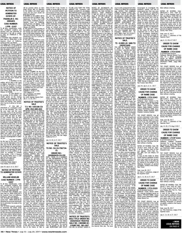 LegaL Notices $662,772.84 If the Trustee is unable to convey title for any reason, the successful bidder’s sole and exclusive remedy shall be the return of monies paid to the Trustee, and the successful bidder shall have no further recourse. The beneficiary under said Deed of Trust heretofore executed and delivered to the undersigned a written Declaration of Default and Demand for Sale, and a written Notice of Default and Election to Sell. The undersigned caused said Notice of Default and Election to Sell to be recorded in the county where the real property is located. NOTICE TO POTENTIAL BIDDERS: If you are considering bidding on this property lien, you should understand that there are risks involved in bidding at a trustee auction. You will be bidding on a lien, not on the property itself. Placing the highest bid at a trustee auction does not automatically entitle you to free and clear ownership of the property. You should also be aware that the lien being auctioned off may be a junior lien. If you are the highest bidder at the auction, you are or may be responsible for paying off all liens senior to the lien being auctioned off, before you can receive clear title to the property. You are encouraged to investigate the existence, priority, and size of outstanding liens that may exist on this property by contacting the county recorder’s office or a title insurance company, either of which may charge you a fee for this information. If you consult either of these resources, you should be aware that the same lender may hold more than one mortgage or deed of trust on the property. NOTICE TO PROPERTY OWNER: The sale date shown on this notice of sale may be postponed one or more times by the mortgagee, beneficiary, trustee, or a court, pursuant to Section 2924g of the California Civil Code. The law requires that information about trustee sale postponements be made available to you and to the public, as a courtesy to those not present at the sale. If you wish to learn whether your sale date has been postponed, and, if applicable, the rescheduled time and date for the sale of this property, you may call (800) 758 - 8052 or visit this Internet Web site WWW.HOMESEARCH. COM, using the file number assigned to this case 030186-CA. Information about postponements that are very short in duration or that occur close in time to the scheduled sale may not immediately be reflected in the telephone information or on the Internet Web site. The best way to verify postponement information is to attend the scheduled sale. FOR SALES INFORMATION: (800) 758 – 8052 CLEAR RECON CORP. 4375 Jutland Drive Suite 200 San Diego, California 92117 July 13, 20, & 27, 2017