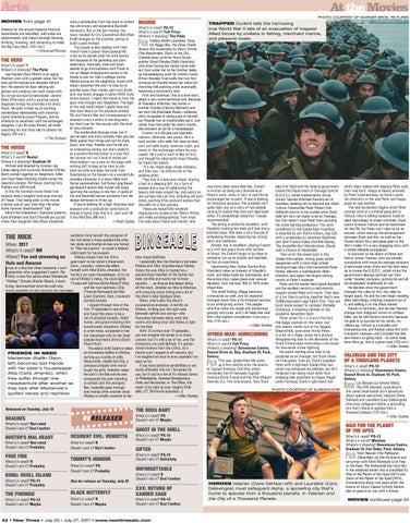 What’s it rated? PG-13 Where’s it showing? Downtown Centre, Sunset Drive In, Stadium 10, Park, Galaxy Luc Besson (La Femme Nikita, The Fifth Element, Lucy) directs this comic book-based sci-fi adventure about special operatives Valerian (Dane DeHaan) and Laureline (Cara Delevingne) who must safeguard Alpha, a sprawling city that’s home to species from a thousand planets. (137 min.) —Glen Starkey