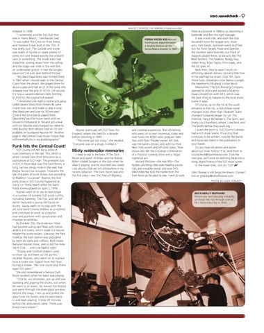 there as a bouncer in 1988 or so, becoming a bartender and then the night manager. It was a wild ride, and soon the club became known for reggae acts, blues acts, rock bands, and even weird stuff like Sun Ra. Rock Steady Posse and Spencer the Gardner were favorites, but Flock of Seagulls played there, as did acts like The Beat Farmers, The Paladins, Buddy Guy, Albert King, Koko Taylor, Chris Isaak, and the list goes on. Back then, the city wasn’t much on enforcing cabaret licenses, so every little hole in the wall had live music: Club 781, Osos Street Subs, Sebastians (now Native Lounge), the basement of Brubeck’s (now Novo). Meanwhile, The SLO Brewing Company opened its doors and started a head-tohead competition with DK’s, which was the best thing to happen to the local music scene in ages. Of course, up on the hill at the south entrance to the city, a club whose name changed more often than Elizabeth Taylor changed husbands began its run: The Hobnob, Yancy McFadden’s, The Spirit, and finally Loco Ranchero, where I saw Beck and The Muffs before they went big. I guess the point is, SLO County’s always had a rich music scene. It’s a story that continues to be written, now by the bands and musicians listed in the publication in your hands. Do you have old photos and stories about our music history? If so, send them to soundcheck@newtimesslo.com. Over the next year, we’ll work on archiving these into a living, digital history of the SLO music scene. In the mean time, rock on, SLO! S✔ Glen Starkey is still living the dream. Contact him at gstarkey@newtimesslo.com. PHOTO BY GLEN STARKEY