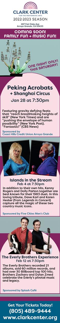 26 • Sun • January 26 - February 2, 2023 • www.santamariasun.com Tickets on sale now at My805Tix.com SELL YOUR TICKETS WITH US AND SEE YOUR EVENT HERE POWERED BY: & Interested in selling tickets with My805Tix? Contact us for a demo today! info@My805Tix.com Scan QR code with camera to sign up for the weekly Ticket Wire newsletter and get all the latest events each Wednesday. We Found Love: Drag Show SATURDAY, FEBRUARY 11 Flower City Ballroom, Lompoc Symphony of the Vines: Whimsical Woodwinds SUNDAY, FEBRUARY 12 Cass Winery, Paso Robles By the Sea Productions: The Psychic FRI, SAT, SUN, FEB. 17–MARCH 12 545 Shasta Ave, Morro Bay The Only Ocean with Goodgrief and Radiation Invasion SATURDAY, FEBRUARY 18 Flower City Ballroom, Lompoc SLO County Jazz: Ernie Watts - Bill Cunliffe Duo SATURDAY, FEBRUARY 18 Mt. Carmel Lutheran Church, SLO 9th Annual Southern Exposure Garagiste Wine Festival FRI & SAT, FEBRUARY 10 & 11 Solvang Veterans Memorial Hall Dunes Center Docent-Led Huell Howser Memorial Nature Walk SATURDAY, FEBRUARY 11 Oso Flaco Lake, Arroyo Grande Full Moon Ceremony & Shamanic Water Ritual SUNDAY, FEBRUARY 5 9th Limb Yoga, Morro Bay Shakti: Embodying the Goddess THURSDAY, FEBRUARY 9 9th Limb Yoga, Morro Bay Anomaly House: The Gearworx (Hard EDM, Goth, Darkwave, Industrial) WEDNESDAY, FEBRUARY 8 Flower City Ballroom, Lompoc Spaced Out Beats with DJs Frank the Tank and Joe Rock SATURDAY, FEBRUARY 4 Flower City Ballroom, Lompoc Pilates/Shuttle to the Lighthouse SATURDAY, FEBRUARY 4 Point San Luis Lighthouse, Avila Beach Cupid Paws Doggie Parade SATURDAY, FEBRUARY 4 Front Street, Avila Beach Americana Night: Gas Station Sushi with The Johnny Come Latelies FRIDAY, FEBRUARY 3 Flower City Ballroom, Lompoc SELL TICKETS WITH US! It’s free! Contact us for more info: 805-546-8208 info@My805Tix.com SLOFunny Comedy Gym SUNDAY, JANUARY 29 Niffy’s Merrimaker, Baywood-Los Osos Anomaly House: Studio 110, An Evening of Disco-Infused House Music on Vinyl FRIDAY, JANUARY 27 Flower City Ballroom, Lompoc Grrl Gore: Hexenghul, Disrupted Euphoria, Sinsation, Pentacaustic SATURDAY, JANUARY 28 Flower City Ballroom, Lompoc SLOFunny Comedy Show SATURDAY, JANUARY 28 Veterans Memorial Building, Morro Bay Point San Luis Lighthouse Tours In-Person WED & SAT Virtual ON DEMAND Avila Beach Women Making Waves: Your New Vibe: Intention, Manifestation, Action FRIDAY, JANUARY 27 Vibe Health Lounge, SLO Nature Nights: Immersive Outdoor Holiday Light & Art Exhibition FRI, SAT, SUN THRU MARCH 19 SLO Botanical Garden Be Hoppy Tours: Sip of SLO Brewery/Cidery Tours THURS & SUN THRU JUNE 29 Begin and end at CC Brewing, SLO Be Hoppy Tours: Friday Hoppy Hour Tours FRIDAYS THRU JUNE 30 Begin and end at CC Brewing, SLO Santa Maria Civic Theatre: The Red Velvet Cake War FRI, SAT, SUN, JAN. 27, 28, 29 1660 N. McClelland, Santa Maria