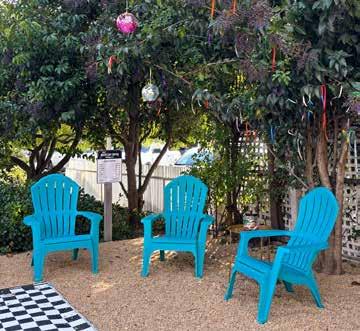 Just steps away from the ordering window, Adirondack chairs and a couple of outdoor furniture sets wait for customers to sip on espresso beverages or munch on breakfast burritos under the shade of the café’s wishing tree.