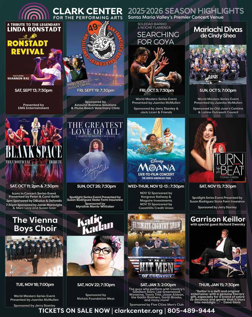 A TRIBUTE TO THE LEGENDARY LINDA RONSTADT WITH RONSTADT REVIVAL FEATURING SHANNON RAE Experience Ronstadt Revival—Shannon Rae and a 7-piece band bring Linda Ronstadt’s legendary hits to life with raw, authentic, 100% live music and heartfelt storytelling. Sept. 13 7:30-9:30 p.m. $44.50-$65.50. (805) 489-9444. clarkcenter.org. Clark Center for the Performing Arts, 487 Fair Oaks Ave., Arroyo Grande.