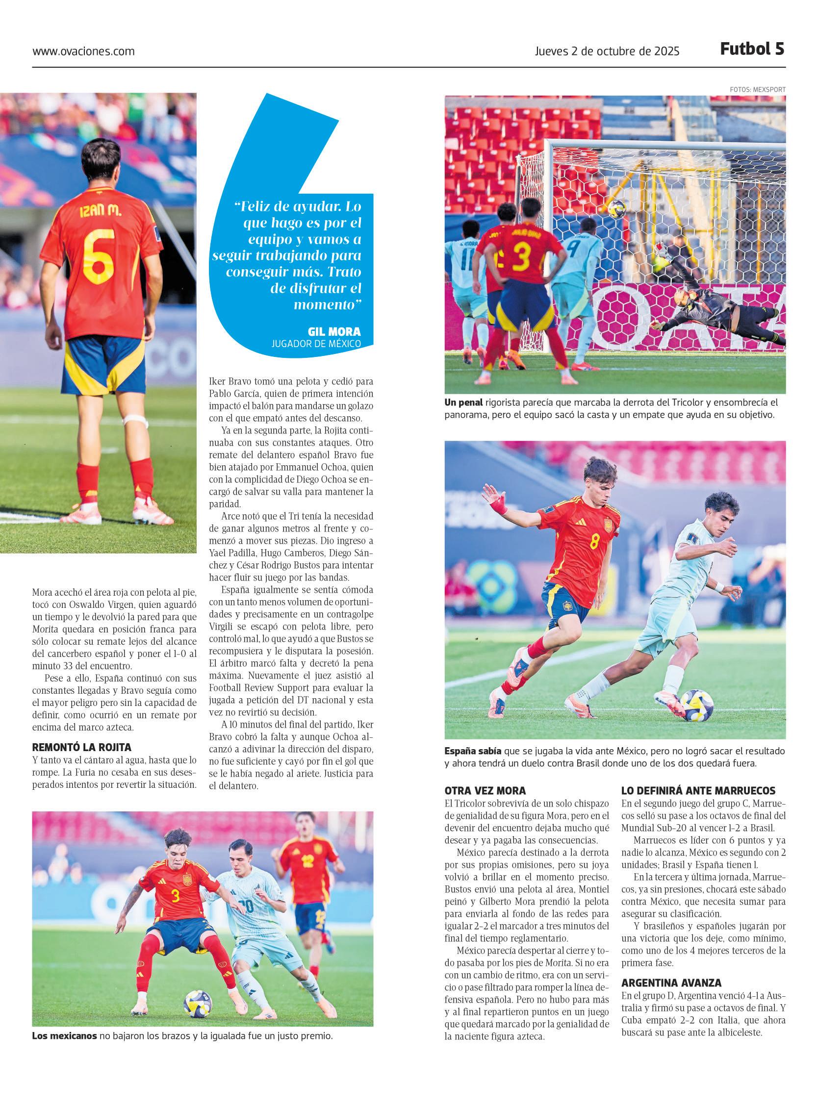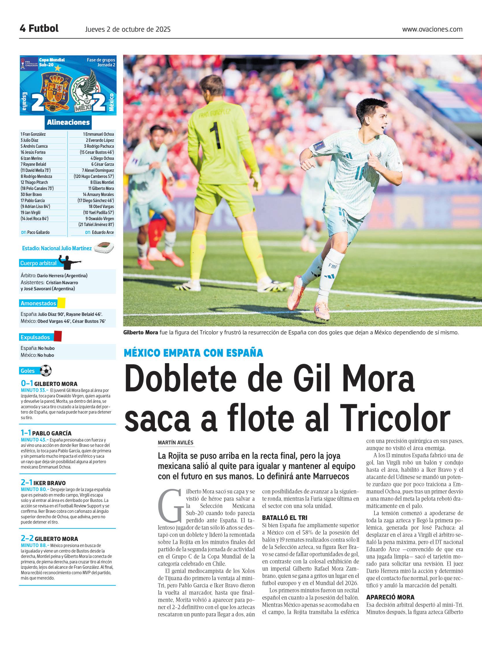 ● CHILE. Los seleccionados de España y México empataron 2-2 en el segundo partido del Grupo C del Mundial Sub-20, en una noche estelar para Gilberto Mora, el joven azteca de 16 años que marcó un doblete y se apunta para ser la estrella de la competición. OVACIONES