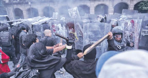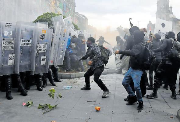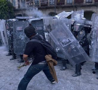 Este bloque escaló la violencia al llegar al Zócalo y elementos de la SSC tuvieron que intervenir para contener los destrozos, pues los encapuchados saquearon una tienda e incluso incendiaron una joyería.