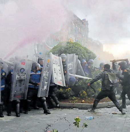 Violencia. Un policía capitalino fue alcanzado por el fuego durante los enfrentamientos con los manifestantes.