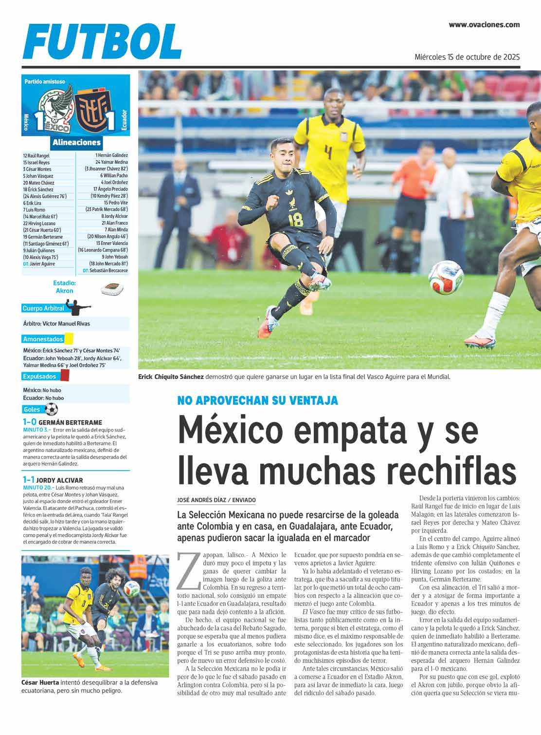 ● MAL RESULTADO. A México le duró muy poco el ímpetu y las ganas de querer cambiar la imagen luego de la goliza ante Colombia. En su regreso a territorio nacional solo consiguió un empate 1-1 ante Ecuador en el Estadio Akron, resultado que para nada dejó contenta a la afición. OVACIONES