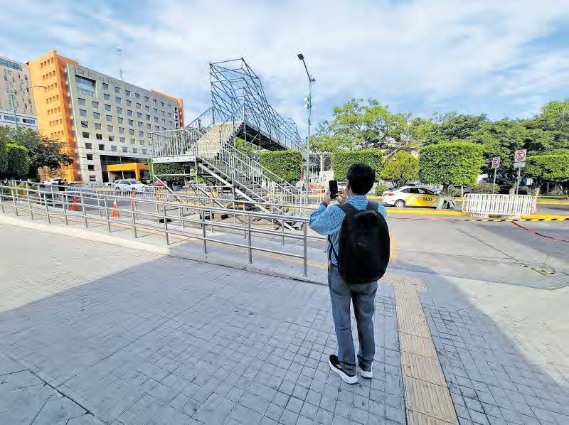 ● SORPRENDE. Un puente peatonal temporal fue instalado en el cruce de avenida de Las Rosas y Mariano Otero, frente a Expo Guadalajara, con el propósito de facilitar el cruce de peatones durante la Expo Transporte ANPACT 2025. La estructura metálica, de fabricación alemana, conecta el estacionamiento público con la plazoleta principal del recinto y estará en operación del 12 al 14 de noviembre, periodo en que se espera la asistencia de más de 60 mil visitantes. Al concluir el evento, el puente será desmontado. Miguel Ángel Vidal ZMG 3A