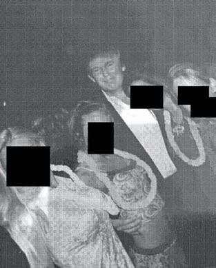 En una foto en blanco y negro, Trump aparece sonriendo con varias mujeres -cuyos rostros están ocultosa su lado. Una segunda imagen muestra a Trump de pie junto a Epstein, y una tercera, menos clara, le muestra sentado junto a otra mujer, cuyo rostro también está borrado, con la corbata roja aflojada. No está claro cuándo ni dónde se tomaron las fotos.