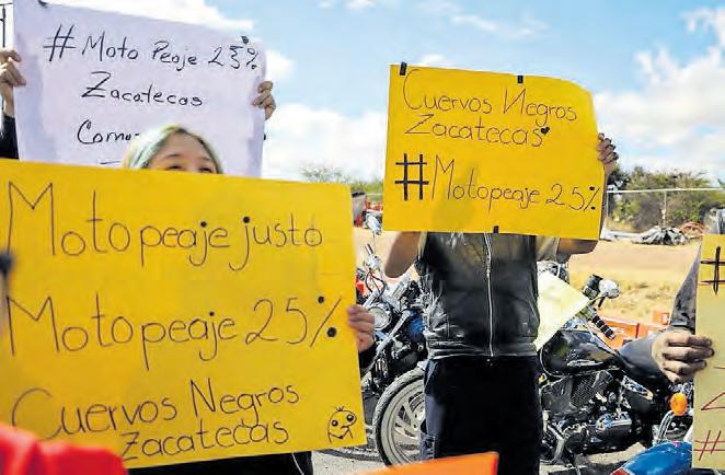 ● UN GRUPO de motociclistas protestó en las casetas de Osiris-Aguascalientes y Fresnillo para exigir la disminución en las cuotas de peaje hasta en 25 por ciento, al considerar que sus vehículos no generan un desgaste en la cinta asfáltica como los carros y transportes pesados. La protesta solo se hizo con pancartas en las inmediaciones de las casetas, sin obstruir las vialidades. Los motociclistas dieron avisto a la Guardia Nacional (GN) y otras corporaciones de seguridad. LANDY VALLE A3 Y A9