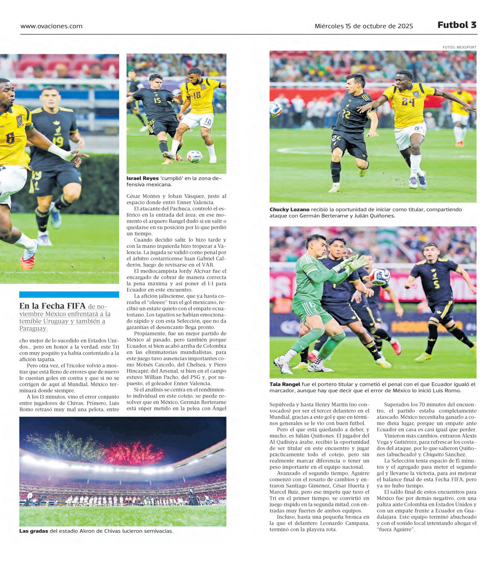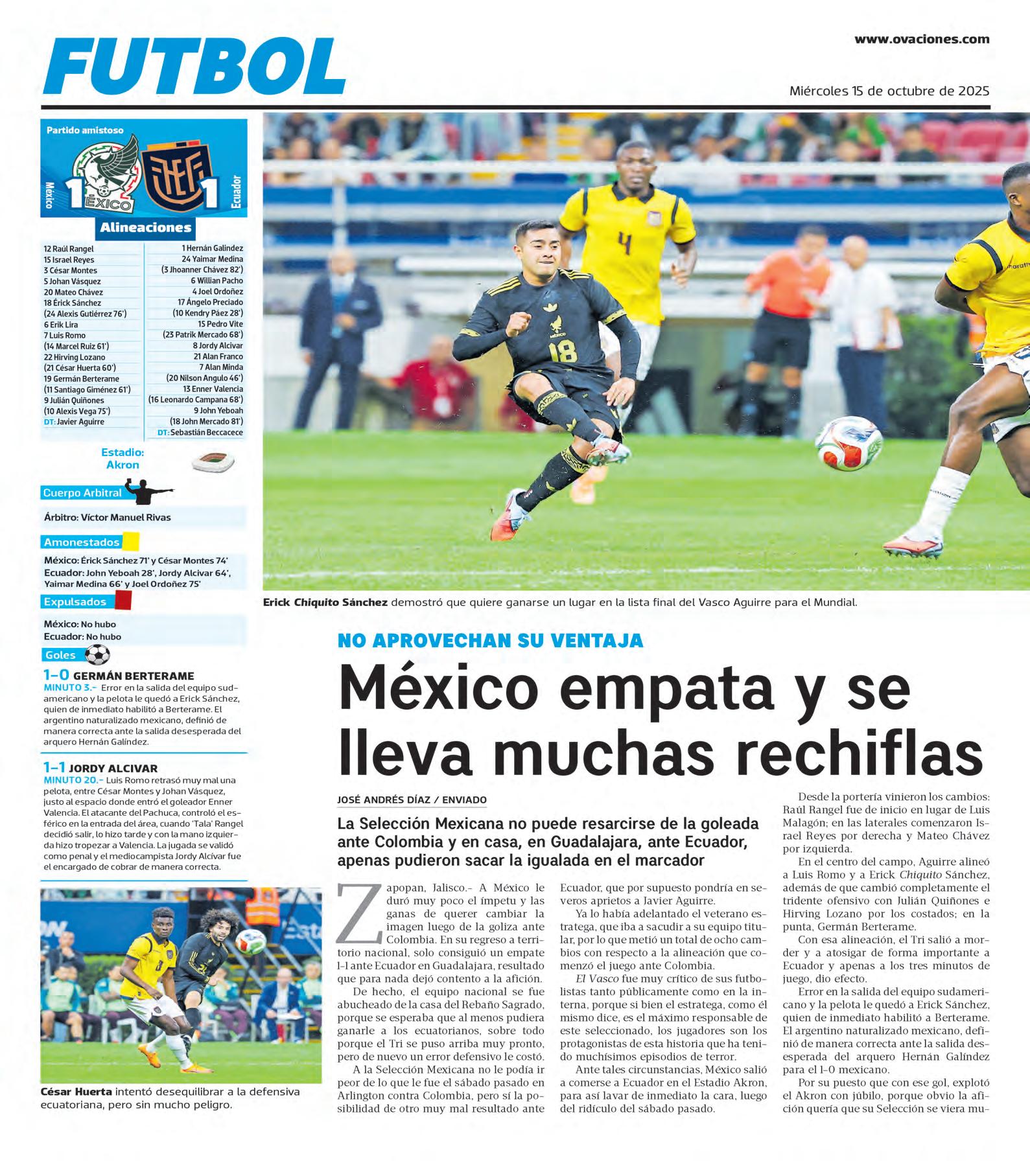 ● EL COMBINADO azteca consigue el empate a 1 contra Ecuador, después de la dolorosa derrota 4 a 0 ante Colombia. Los pupilos de Javier Aguirre se fueron adelante al minuto 2 y los sudamericanos igualaron el marcador con un penal. Después no hubo ideas al ataque. OVACIONES O2 A O4