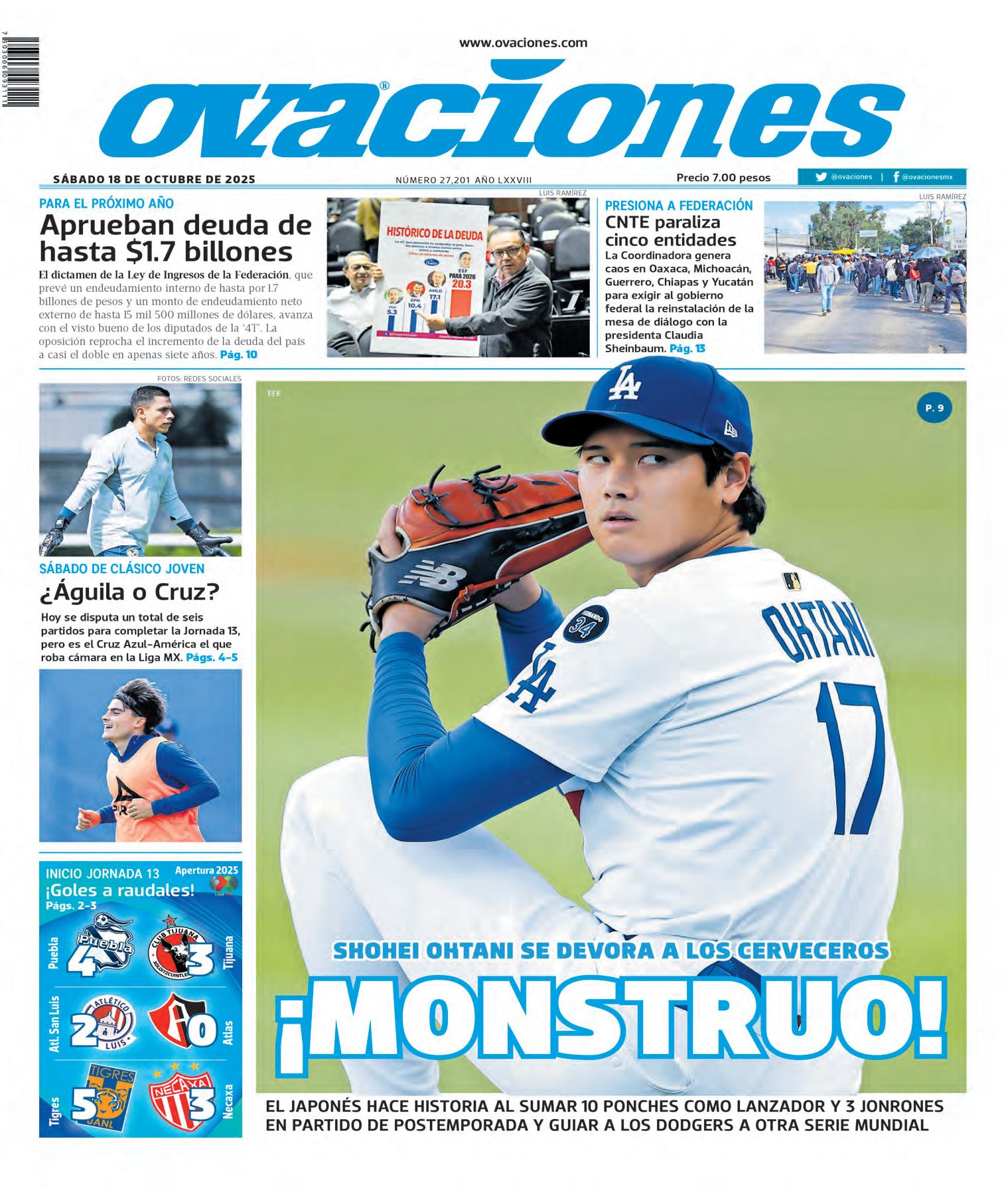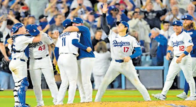 ● LOS ÁNGELES. Shohei Ohtani logró tres cuadrangulares y pitcheo en blanco en seis entradas para llevar a Dodgers a una victoria de 5-1 sobre Cerveceros de Milwaukee ycon ello a la Serie Mundial, por segundo año seguido. OVACIONES O9