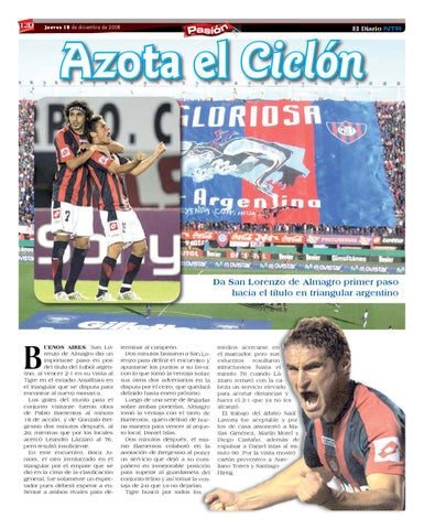 UENOS AIRES. San Lorenzo de Almagro dio un importante paso en pos del título del futbol argentino, al vencer 2-1 en su visita al Tigre en el estadio Amalfitani en el triangular que se disputa para encontrar al nuevo monarca. Los goles del triunfo para el conjunto visitante fueron obra de Pablo Barrientos al minuto 18 de acción, y de Gonzalo Bergessio dos minutos después, al 20, mientras que por los locales acercó Leandro Lázzaro al 76, pero resultó insuficiente. En este encuentro, Boca Juniors, el otro involucrado en el triangular por el empate que se dio en la cima de la clasificación general, fue solamente un espectador pues deberá esperar a enfrentar a ambos rivales para de-