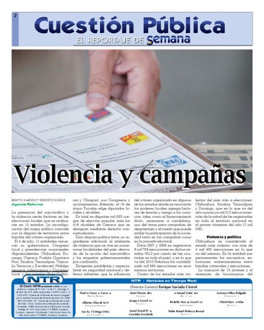 del crimen organizado en algunos de los estados donde se renovarán los poderes locales agrega factores de tensión y riesgo a los comicios, tales como el financiamiento ilícito, amenazas a candidatos, uso del tema para campañas de desprestigio y el miedo que puede inhibir la participación de la sociedad tanto en las campañas como en la jornada electoral. Entre 2007 y 2009 se registraron 8 mil 769 ejecuciones en dichos estados (62.3 por ciento de las ocurridas en todo el país), y en lo que va del 2010 Reforma ha contabilizado mil 684 ejecuciones en esos mismos territorios. Cuatro de los estados más vio-