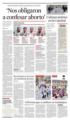 un padre y una madre. Exigimos ser escuchados porque son temas que no se contemplan y en ese sentido existe una discriminación”, señaló. Al término de la manifestación, sobre un templete colocado en la Plaza de los Fundadores, un grupo de jóvenes de Jalisco lanzó consignas contra los Ministros y aseguraron que su estado promoverá su destitución. Por la tarde, en un foro alterno a la Conferencia Mundial de la Juventud que denominaron “Dilo fuerte”, el secretario de Gobierno de Guanajuato, Gerardo Mosqueda, exhortó a los jóvenes a escribir a los Ministros para manifestar su rechazo a la aprobación de las uniones entre parejas de homosexuales, su derecho a la adopción, así como a la legalización del aborto en el DF.