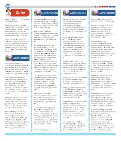 Juchipila, Zac., informes al tel. 01 (467) 95 2 09 72, 95 2 21 89.A4 Estrada’s casa funeral, servicios funerarios en General traslados Nacionales e internacionales servicios las 24 horas, en C. Vicente Guerrero #5, Juchipila, Zac, informes al tel. (467) 95 2 22 13 u 95 2 09 72.A4 Farmacia Ahuacatlan. Surtido en medicamentos de patentes, similares y genericos intercambiables y de primer nivel. surtido en lacteos, perfumeria, pañales. Descuentos Reales y permanentes.Horario 9am a 10pm. Calle Alfonso Medina # 26 La Blanca,Zac.A4 Taller Econo Hojalatería y Pintura. Trabajos garantizados. Carretera a Pinos #58, junto al hotel, salida a Ojocaliente. Tel. 01-458-93-184-36 y Cel. 458-107-86-15. La Blanca, Zac.A4 Materiales El Pueble les ofrece todo para su construcción, cemento, cal, varilla, armex, yeso. Estamos a sus órdenes en Morelos #17, Col. Morelos, Ciudad Cuauhtémoc, Zac. Entregamos a domicilio al tel. (458) 94 101 98.B2 Modas Melva: En esta primavera podrás encontrar los mejores estilos de temporada y ahora por liquidación toda la ropa de invierno con descuentos. Visítanos en calle Guerrero #11, centro. Ciudad Cuauhtémoc, Zacatecas.F3 Funerales San Miguel: Ataúdes finos y económicos, embalsamados profesionales, cremaciones, traslados dentro y fuera de la República Mexicana. Cel. 458102-25-73. Correo: pedro28@ live.com Sucursales: Cosío, Aguascalientes. Tel 98-7-11-20. Cuauhtémoc Tel: 458-94-101-66 y Genaro Codina, Matamoros #203. Ciudad Cuauhtémoc, Zac.B4