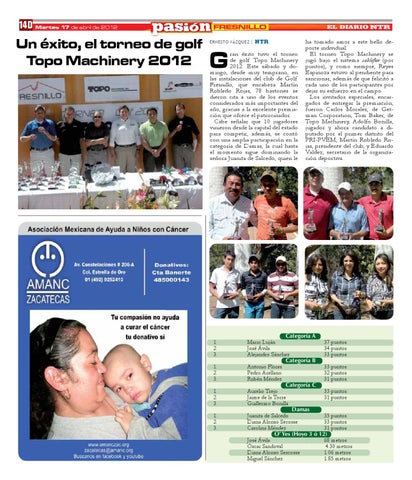 ran éxito tuvo el torneo de golf Topo Machinery 2012. Este sábado y domingo, desde muy temprano, en las instalaciones del club de Golf Fresnillo, que encabeza Martín Robledo Rojas, 78 bastones se dieron cita a uno de los eventos considerados más importantes del año, gracias a la excelente premiación que ofrece el patrocinador. Cabe señalar que 10 jugadores vinieron desde la capital del estado para competir, además, se contó con una amplia participación en la categoría de Damas, la cual hasta el momento sigue dominando la señora Juanita de Salcedo, quien le