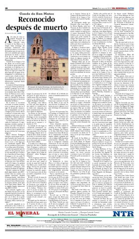 los demás condes. Hablaron con el Virrey Marqués de Casa Fuerte para que platicara con el Conde y lo hiciera cambiar de decisión. Sabían que si se iba Fernando el desarrollo de Zacatecas disminuiría considerablemente. El Conde de San Mateo para olvidar los disgustos que pasó con sus hijas acondicionó su hacienda principal en San Mateo de Valparaíso y se casó por segunda ocasión con Isabel Rosa Catarina de Cevallos Villegas, comentó. Una año más tarde en la ciudad de Zacatecas nació su hija Ana María de la Campa y Cos Cevallos, en un palacio que el mismo Conde de San Mateo mandó cimentar frente a la Plazuela Villareal. La historiadora María del Carmen Veyna relató que en 1739, tres años antes de morir Fernando de la Campa y Cos, inició otra etapa más de su existencia, renunció a todas las comodidades que tenía y se fue a vivir solo como ermitaño a una cueva cerca de su hacienda de San Mateo, una persona le llevaba comida y tenía un pozo de agua para subsistir. “Hay quienes dicen que se fue a este lugar a orar y acercarse a Dios, pues platican que una noche tuvo un sueño en el que veía que los demonios se llevaban a la mujer que acusaron de hacer tenido una relación fuera de matrimonio con él, y por arrepentimiento lo hizo”, enfatizó. Fernando de la Campa y Cos en ese tiempo tenía 33 haciendas en Zacatecas, Durango, Jalisco, San Luis Potosí y Guanajuato. Algunas haciendas que fueron de su propiedad son: Santa Catalina, San Miguel, El Vergel, Corrales, San Matías, Santa Teresa, San Antonio, San Juan Capistrano, Juan Pérez, San Pedro, Dolores, San Sebastián, Pozo Hondo y La Salada. De demonio a Santo Marco Antonio Rodríguez Sifuentes declaró que antes existía mucha desinformación en cuanto al Conde de San Mateo, debido a que con él se atemorizaba a los niños, “les decían que si se portaban mal se les iba aparecer, pues había quienes aseguraban haberlo visto en las noches de penumbra cerca del templo de Santo Domingo con una capa larga”. Durante un recorrido realizado por los principales comercios de Sombrerete se observó que en algunos varias personas lo tienen como un santo con una veladora, con el fin de que las ventas mejoren y los minoristas dijeron que a partir de esta acción les ha ido muy bien. En este año se espera que el museo esté terminado, se ubicará en las inmediaciones de la Estación del Ferrocarril, cerca del cerro El Sombreretillo. La infraestructura medirá 60 metros de largo por 20 de ancho y tiene una altura de seis metro, el inmueble está en desuso desde hace 25 años. El pintor Juan Carlos García Solís detalló que serán 30 las obras que se expondrán, empezó a realizarlas en abril de 2011 y al momento ha finalizado cerca de la mitad, cada una es de 60 por 90 centímetros y la técnica que empleó es óleo. “Algunas pinturas son del bautismo y nacimiento del Conde de San Mateo, de su llegada a la Nueva España, de la compra de sus primeras tierras, y de cuando fue guardián de la orden de Sombrerete, también a la entrada del museo se colocara una estatua de Fernando de la Campa y Cos que medirá 10 metros”, sostuvo.