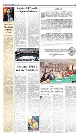 ese a que en su visita a Zacatecas el presidente de México, Enrique Peña Nieto, dejó en claro que gobernará para todo el país, integrantes del Comité Directivo Estatal del Partido Revolucionario Institucional (PRI) insistieron en que la amistad entre él y Miguel Alonso Reyes traerá mayores beneficios para la entidad. En conferencia de prensa, Juan Carlos Lozano Martínez, dirigente tricolor, afirmó que dicha relación trajo beneficios al estado y no discursos retóricos, “en donde es palpable la esperanza de los ciudadanos ante los compromisos que se habrán de cumplir”. Muestra de lo fructífera que fue esta primera visita en su gestión como presidente – aseveró–, fue la asignación de más de mil 200 millones de pesos, como parte de los recursos extraordinarios para el sector agropecuario. Además, refrió que el primer mandatario dio la instrucción para que de inmediato se apliquen 231 millones de pesos y se construyan obras para captar más agua y aminorar los efectos de la se-