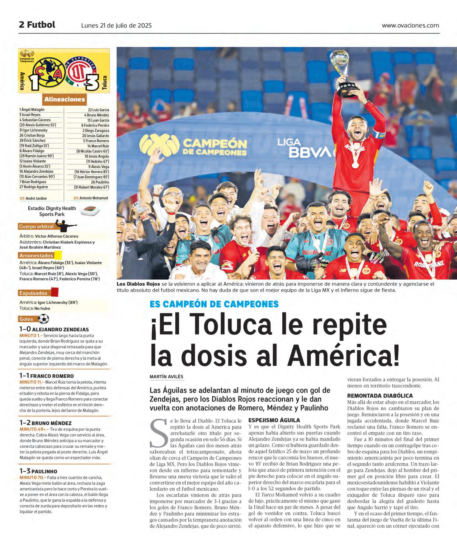 ● EL TOLUCA le repite la dosis a las Águilas al ganar 3-1 y arrebatarles otro título en apenas 56 días. Los Diablos se consolidan como el mejor equipo del futbol mexicano. MARTÍN AVILÉS OVACIONES O2 Y O3