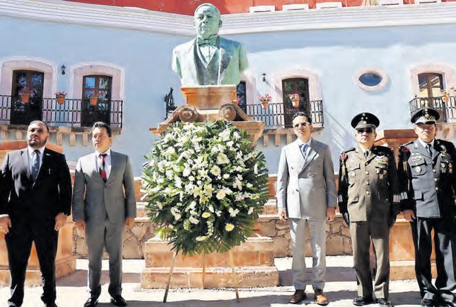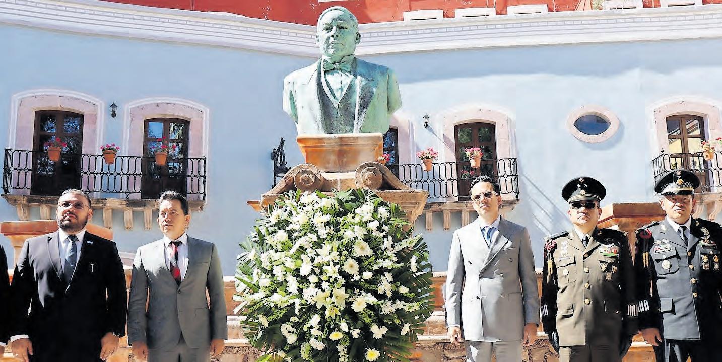 ● ZACATECAS. Con la participación de autoridades civiles, militares y educativas, este sábado se conmemoró el aniversario 220 del natalicio del ex presidente Benito Juárez García en el monumento en su honor edificado en el jardín que lleva su nombre en el Centro Histórico de la capital. El secretario general de Gobierno, Rodrigo Reyes Mugüerza, destacó la vigencia del legado juarista, al señalar que el ex presidente no solo fue un símbolo histórico, sino también un referente de valores como la legalidad, la resiliencia y la defensa de la soberanía nacional.