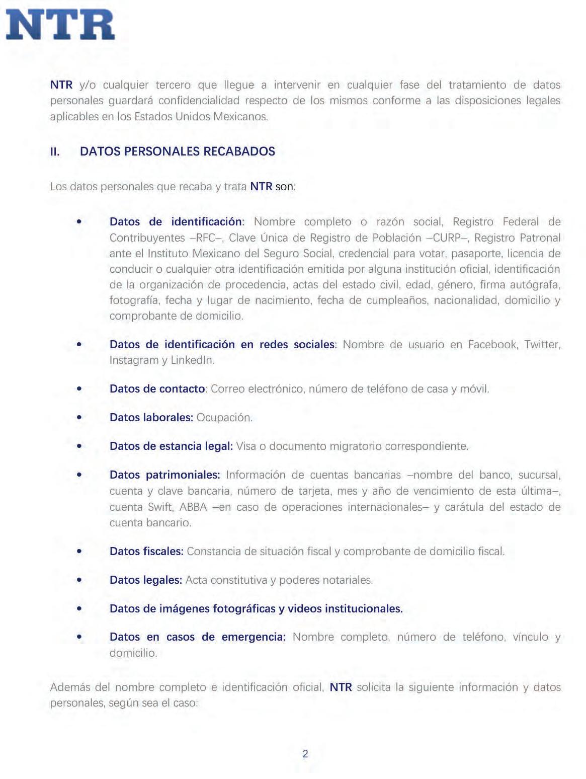 NTR podrá recabar datos como nombre, correo electrónico, nombre de usuario, fecha de nacimiento, foto de perfil y género a través de sus Páginas Web; dichos datos serán proporcionados de manera voluntaria por los titularesal suscribirse a boletinesy/o alcrear unperfilpersonal en dicho sitio.
