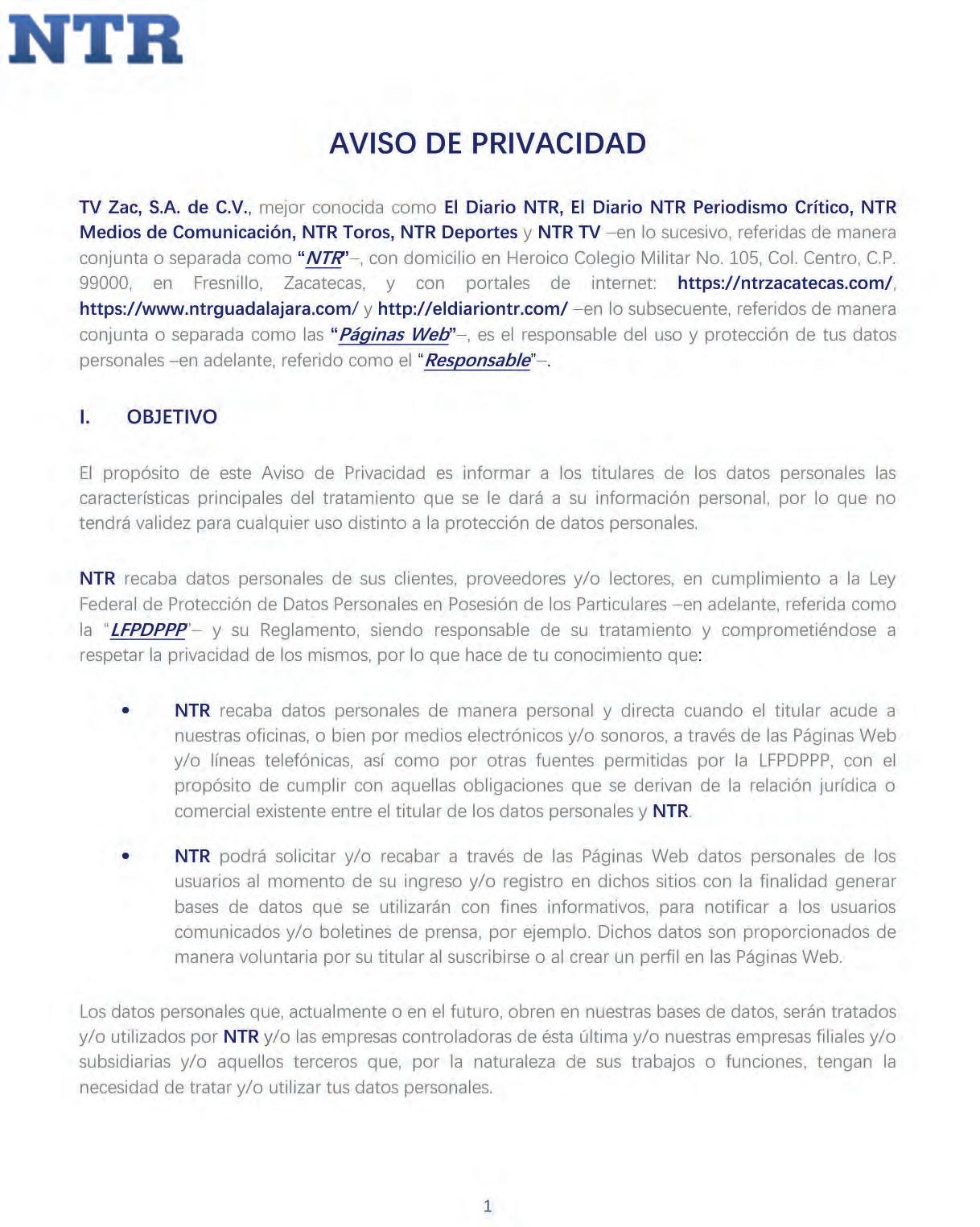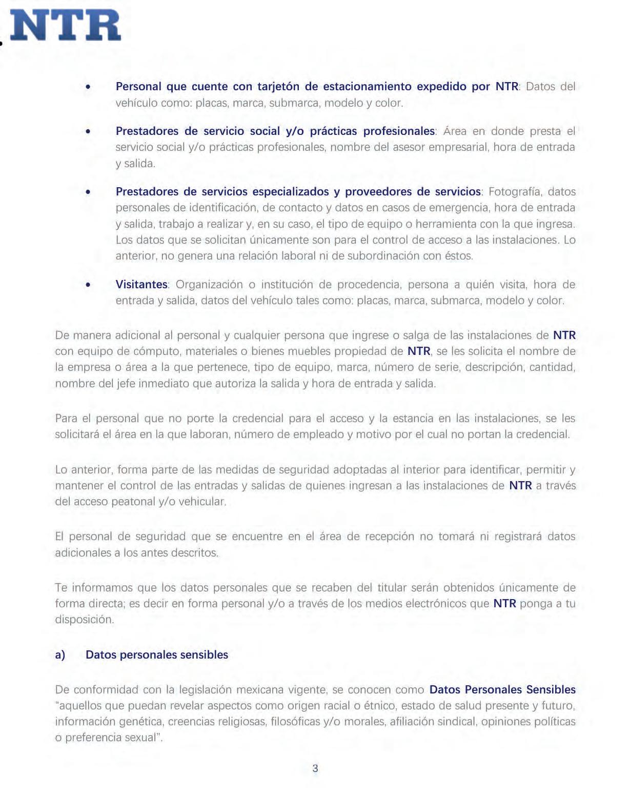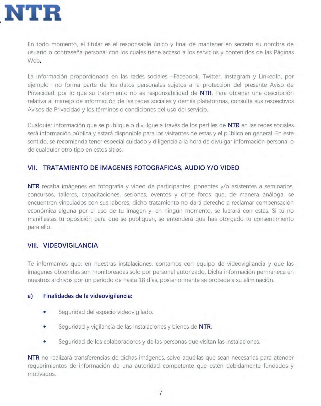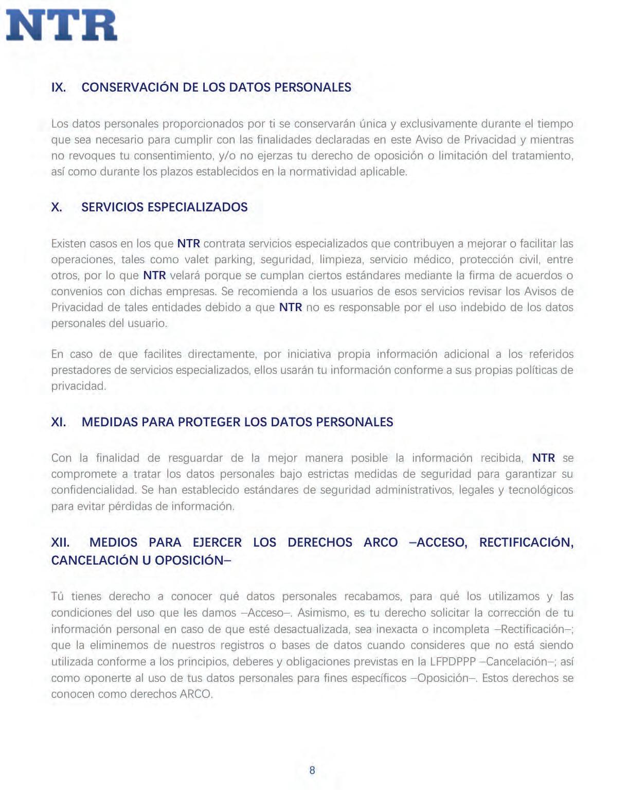 Los datos personales que los usuarios llegaren a proporcionar a través de estos portales o sitios de internet no se encuentran contemplados en este Aviso de Privacidad y su tratamiento no es responsabilidad de NTR, ya que se sujetarán a los respectivosAvisos de Privacidad publicados encada uno de esos sitios.