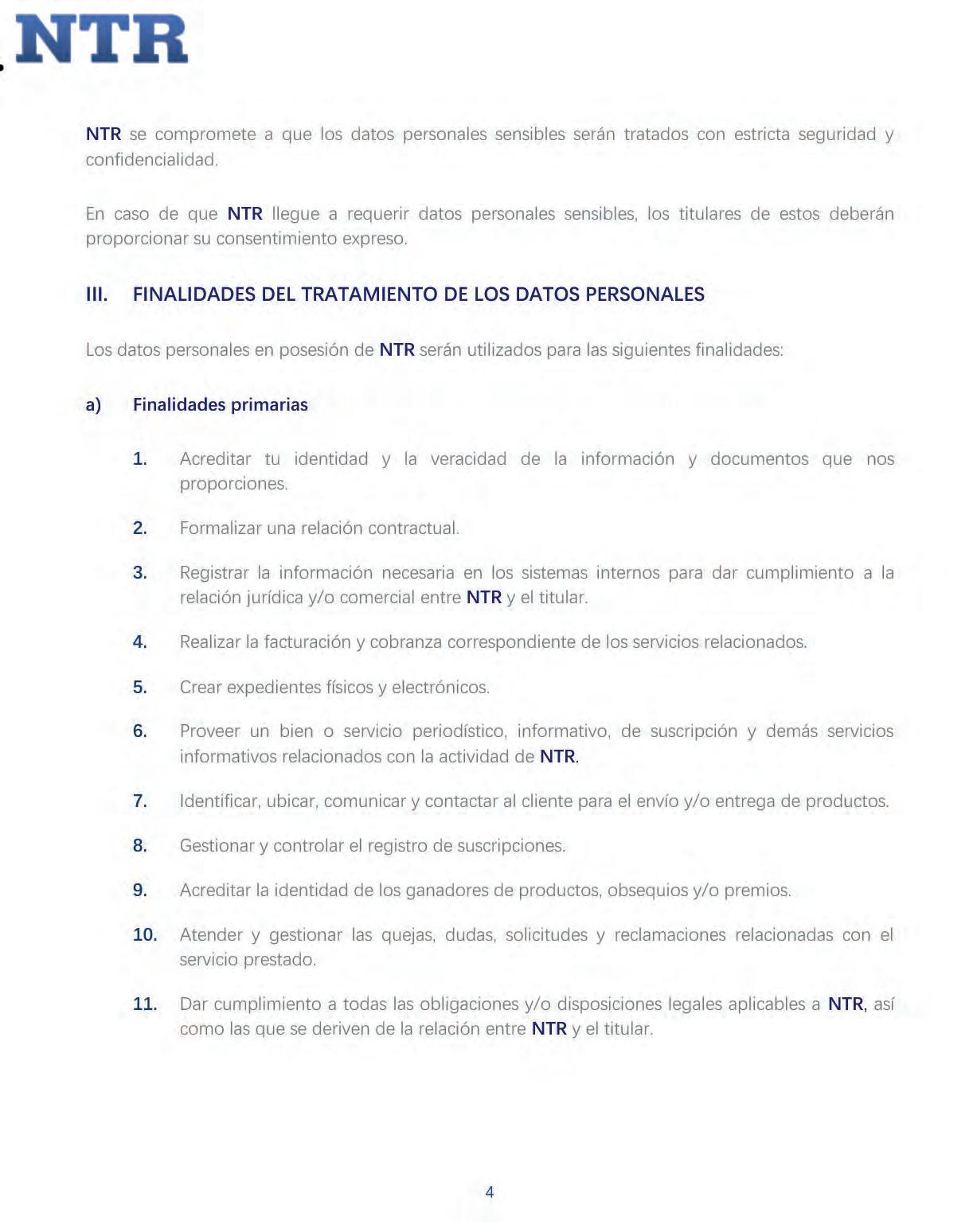 La negativa para el uso de tus datos personales para estas finalidades secundarias no podrá ser un motivo para que te neguemos los servicios y productos que solicitas o contratas de NTR.