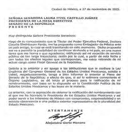 Sin cumplir con el requisito de “una causa grave”, el Senado de la República recibió y aprobó, en fast track y solo con la mayoría de Morena, PVEM y PT, la renuncia de Alejandro Gertz Manero como titular de la Fiscalía General de la República (FGR). En una carta enviada a la Cámara alta, Gertz Manero argumentó que deja el cargo porque la presidenta Claudia Sheinbaum “me ha propuesto como embajador de México ante un país amigo” –que entre senadores se aseguró será en Alemania–. EL FINANCIERO F12