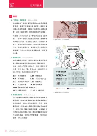 活動。11月6日更與片商合作,加辦1場星光特 映會,放映《大「醫」新鮮人》,2018年共計 991人參加。播放日期與片名如下: 1.17 樂來越愛你 4.26 奇異博士