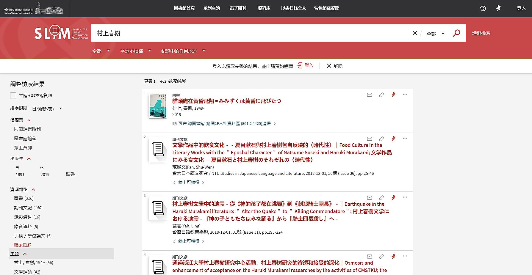 SLIM)整合圖書館各項資源,可同時查詢本館館藏目錄、各大期刊文獻資料庫、本 校機構典藏、以及本館自建數位典藏系統。不論是圖書期刊名稱、期刊文章、作者名、 關鍵字、ISBN、ISSN,只要在圖書館首頁點選「雲端圖書館自動化系統」,就可在 單一平臺查得圖書館的豐富資源。