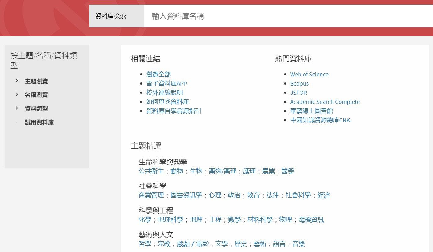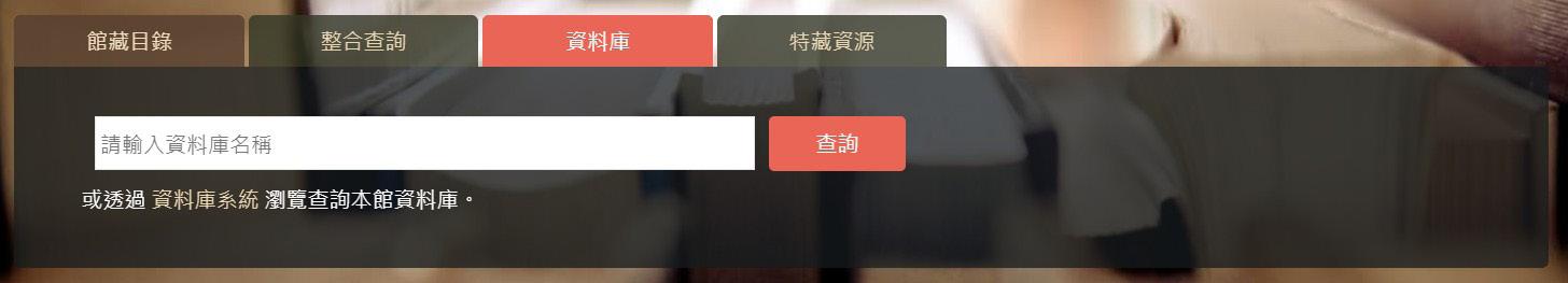 請由圖書館首頁點選「資料庫」頁籤,直接輸入您欲查詢的資料庫名稱。若您想透過 主題或資料類型瀏覽本館有哪些資料庫,可點選下方「資料庫系統」連結查看。
