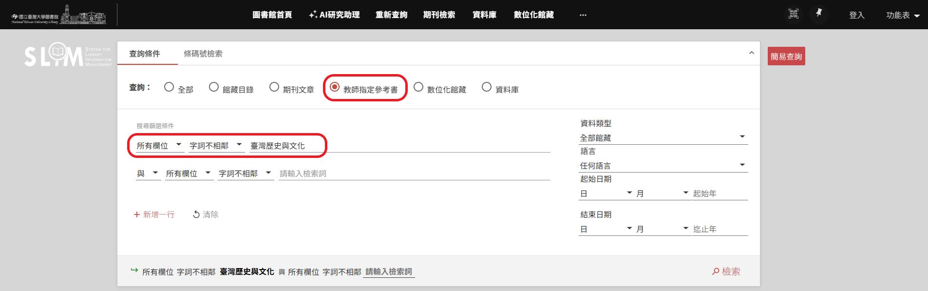 教師因授課需要,可將學生必讀之圖書(含電子書)及視聽資料列為 指定參考資料。您可利用「進階查詢」的「教師指定參考書」功能, 輸入課程名稱或授課教師進行查詢。